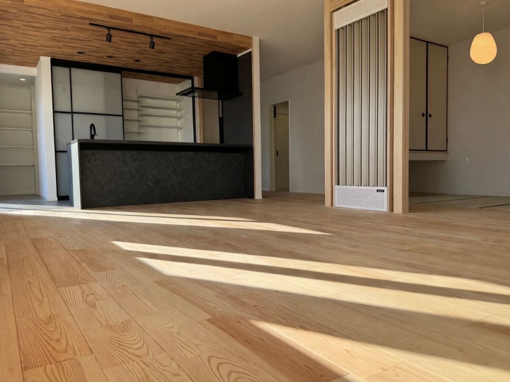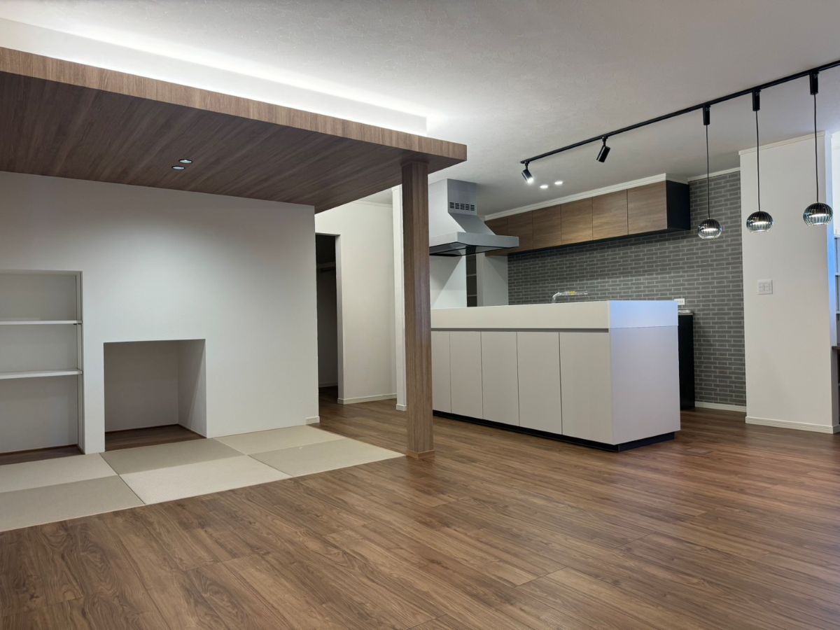 LDK、木目の天井と間接照明の組み合わせが素敵です🤎